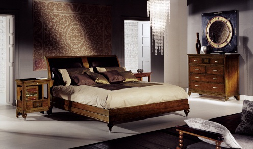 Headsets for bedrooms from Italian manufacturer Decora. Consists of double bed, bedside cabinets and dresser with drawers. Frames made of solid wood. The headboard is covered with black textiles. Fittings of gilt metal. Feature models legs curly shape. Set made in a classic style.