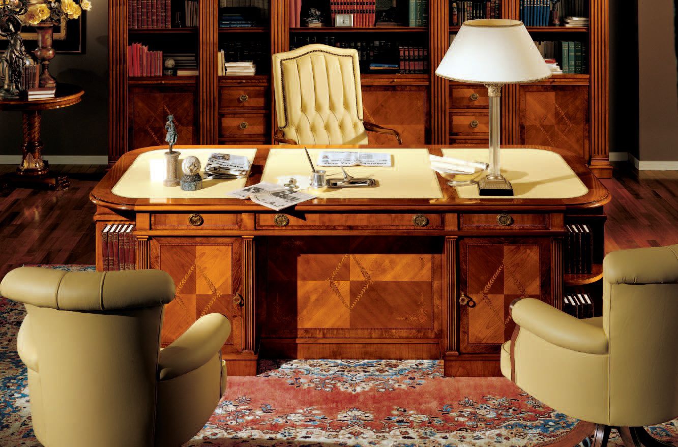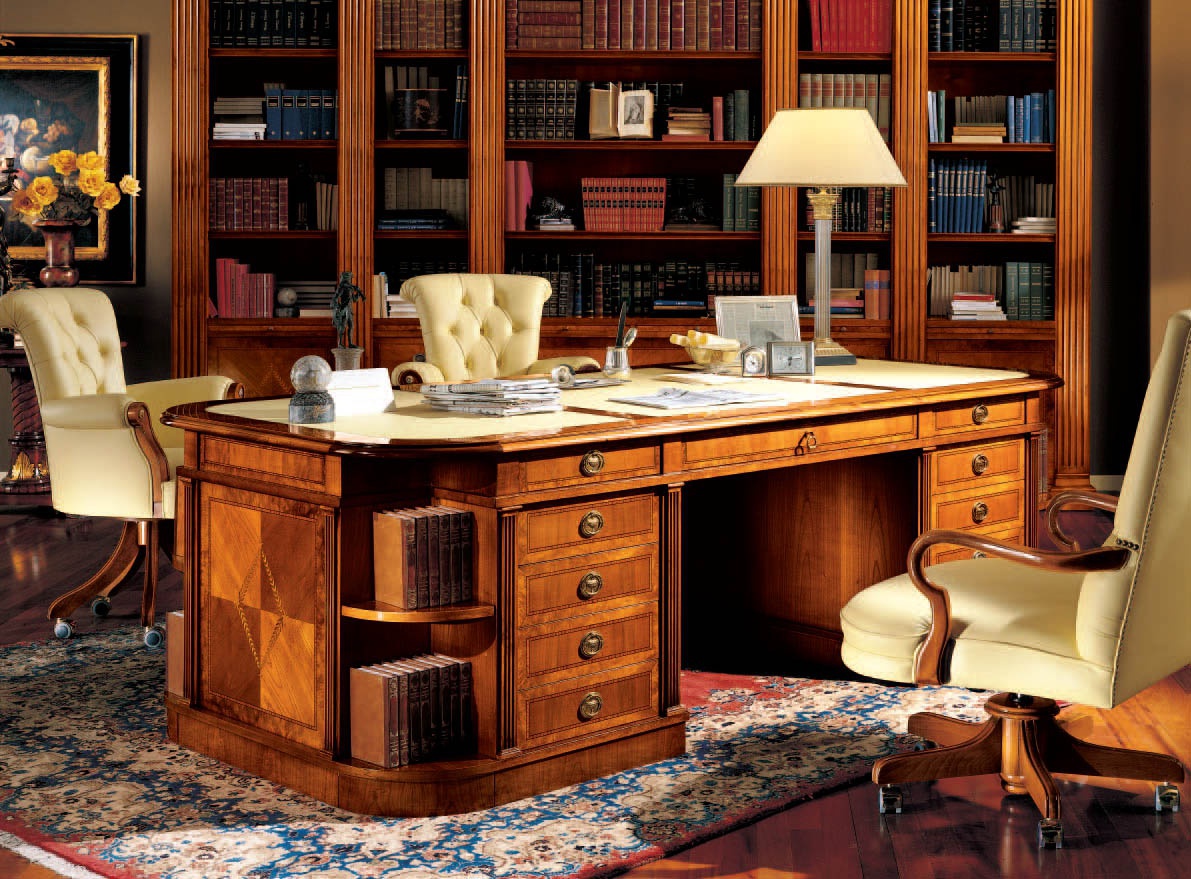Italian set for Cabinet production Armando Rho. This headset is presented the model of the Desk, chairs and shelving. Writing Desk made from solid cherry, insert - the array of maple and pear. Desk with drawers and hinged doors. Headset natural color wood with accents of genuine white leather.