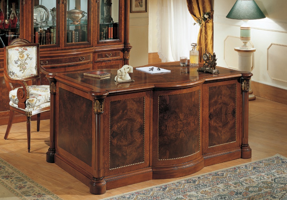 Italian set for Cabinet production Fratelli Bianchini. The presented model of the Desk and Desk chair. Writing table in classic style. Skeleton models made of wood, solid oak. Desk rectangular with drawers decorated with gilt carving. The surface is treated with a special compound naturalny preserving the color of wood and prevents from damage.
