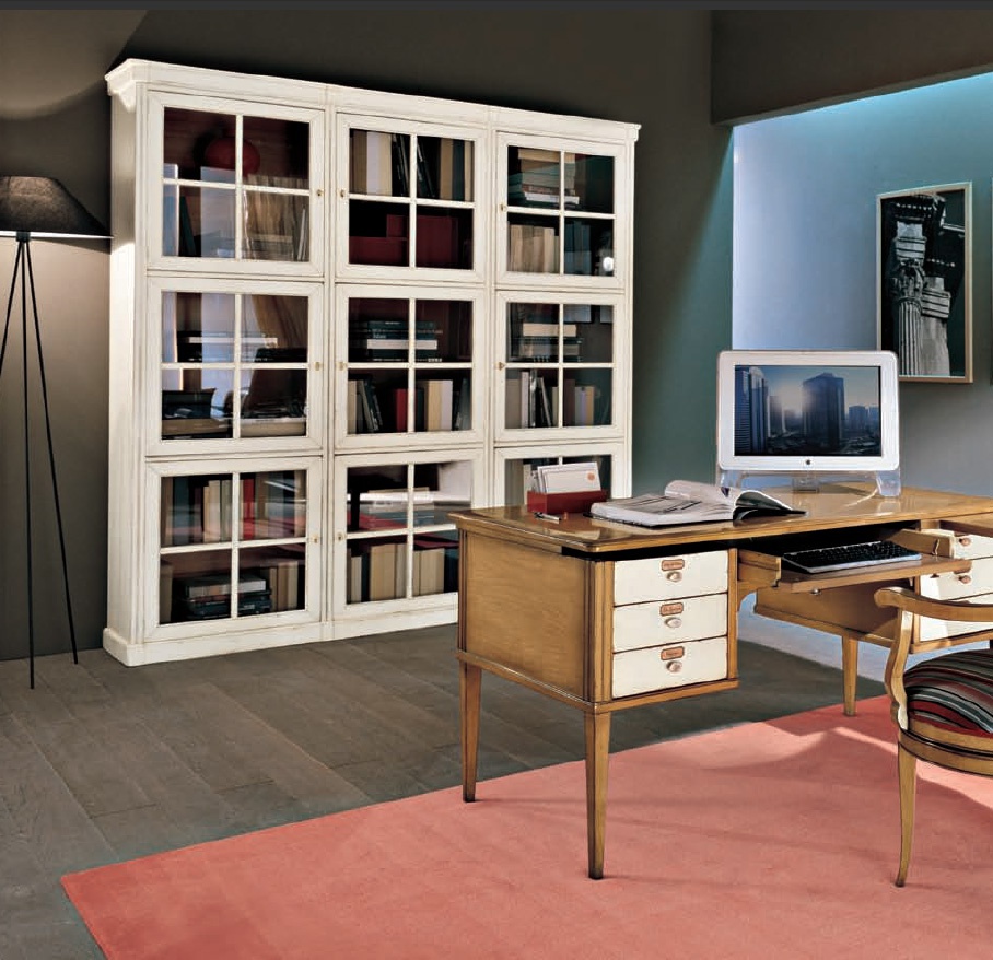 Italian set for Cabinet production Bizzotto. Set is made of natural wood. The presented model of the bookcase, the Desk and chairs. The square Cabinet with hinged doors made of glass, in wooden frame and partitions. The color of the model in white. Colors to be selected from the range of the factory. Writing Desk with drawers and drop down keyboard tray. The chair is solid in color fabric. Perfectly complement the classic interior library or office.