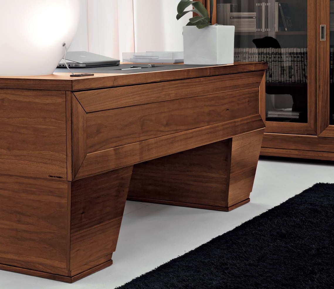 Desk for office production Bruno Piombini. Frame of furniture is made from solid wood. Desk rectangular with drawers. The surface is treated with a special compound brown or coffee color retains natural texture of the wood. To the table factory is a comfortable office chair in leather upholstery. The model will perfectly complement the interior of the Cabinet in the style of modern classics.