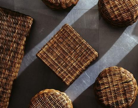Sofa set from Italian manufacturer Gervasoni. Includes triple and double sofas, pouf. Material - natural rattan. Upholstery - textiles. Filling - polyurethane foam. Set is manufactured in contemporary style. Colours in stock.