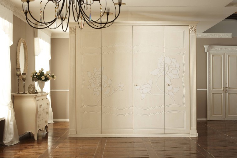 Headsets for bedrooms from Italian manufacturer Benedetti. Set consists of a double bed, bedside tables, chest of drawers and wardrobe. The furniture is executed in classical style. The frame is made from solid wood. High semi-circular headboard, decorated with carved scrolls, upholstered in a soft, textile upholstery milky color .
