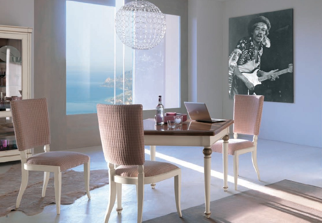 Italian dining room set for production Bizzotto. Set includes: dining table, buffet and chairs in upholstery. Table square shape on a thin carved legs, designed for four seats and is decomposed into two additional. Frame and legs painted in white, table top from solid wood, treated with a special formula preserves the natural color of wood and prevents from damage. The upholstery of the chairs is leather or textile. Sideboard with four hinged doors made of wood, lacquered white. Colors to be selected from the company directory. Set is made in a classic style, perfectly fit into the interior of the living room.