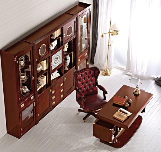 Italian furniture for the office of Regent, production Caroti. Mobile bookcase with swinging doors and drawers, rotating Desk, 7 drawers and leather quilted chair. The furniture is made of natural mahogany or a choice from the directory of the factory, are decorated with elements from metal. A style classic in a nautical theme.