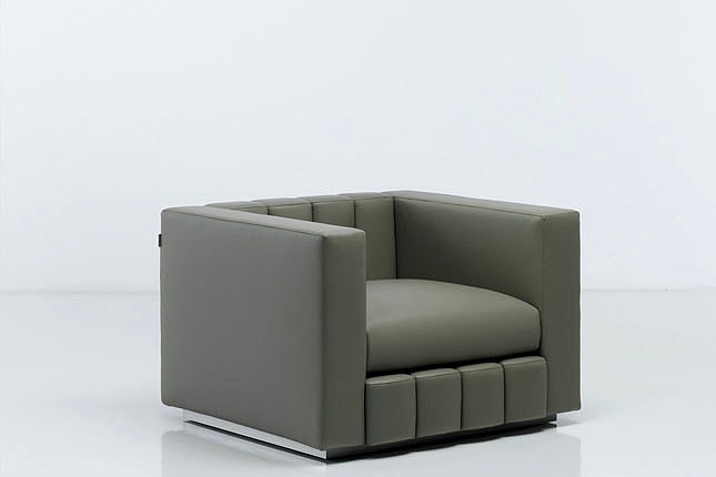 Sofa set from the Italian manufacturer features tisettanta furnishings. Includes three seater sofa and armchair. The model is designed in modern style. The frames are completely hidden. Legs in chromed metal. The upholstery is leather. The colors varied from a range of firms. Set is manufactured in contemporary style.