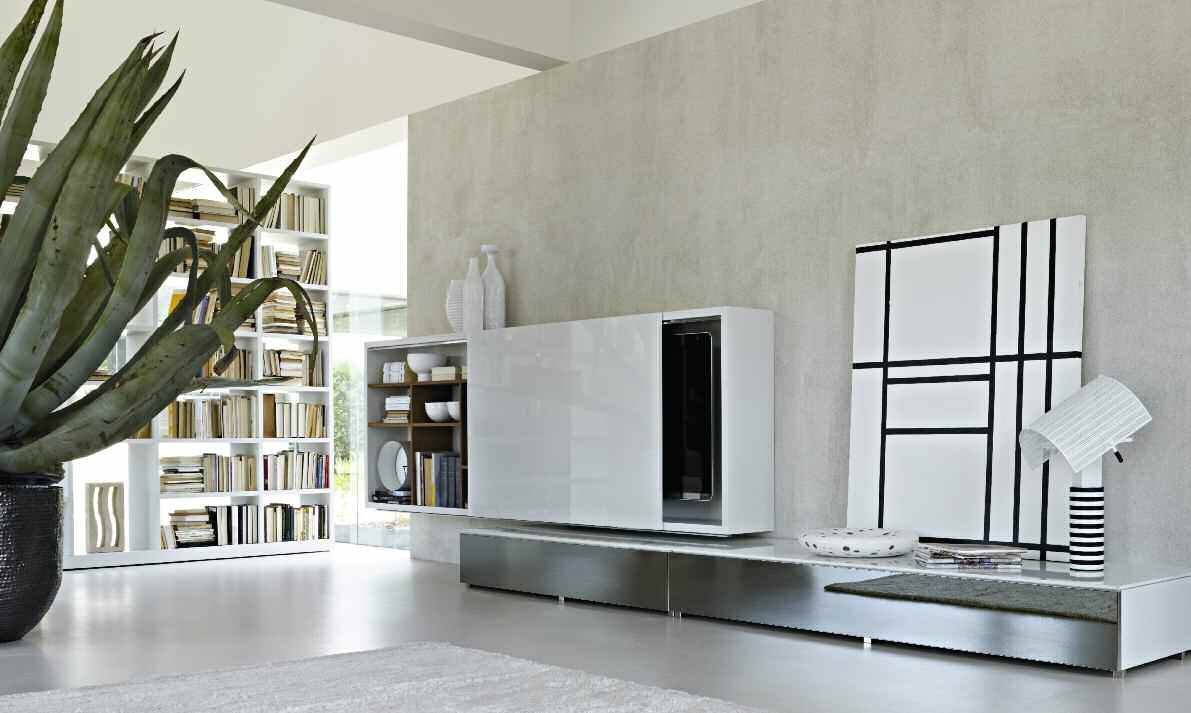 Modular storage system by Italian manufacturer Molteni. The frame is made from solid wood, doors - glass. Finishing varnish from the range of the campaign. Module for books and TV with a sliding door. Pretty model for living room in modern style. Colours in stock.