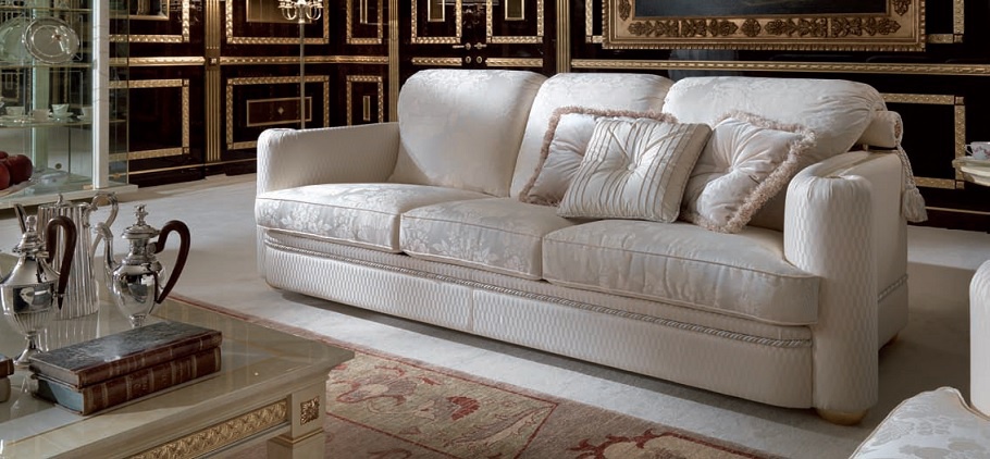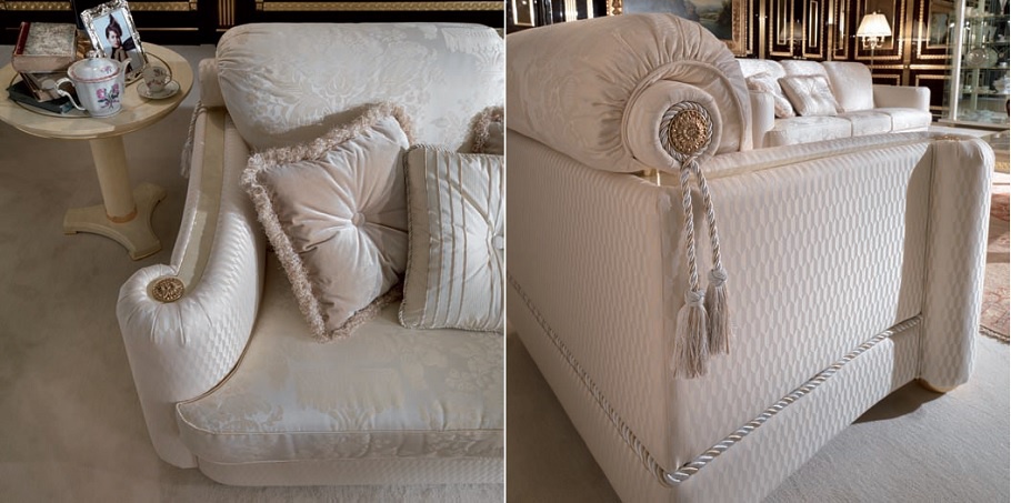 Sofa set, Berry from the Italian manufacturer Turri. Includes two sofas, armchairs, coffee tables. Material - solid wood. Finish to be selected from the range of the company. Upholstery textile white. The cushion filling is foam. Decorated models are hand carved. The tabletop is made of transparent glass. Set made in a classic style.