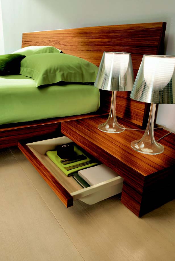 Headsets for bedrooms from Italian manufacturer Morassutti. Set includes double bed with fitted side tables and a chest of drawers. The furniture is made of natural wood. Dresser with drawers. The color of natural wood products.