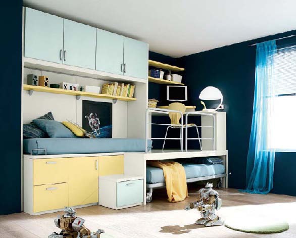 Headsets for children from the Italian manufacturer Morassutti. Set includes two single beds, a wardrobe and a Desk. The furniture is made of solid wood and metal. Colours in stock.