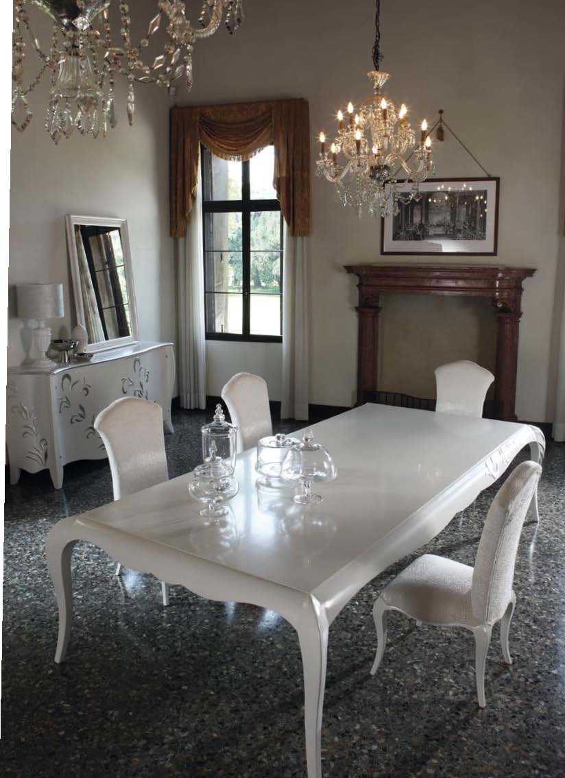 Italian dining room set for the production of Giorgio Piotto. Set includes: dining table, Vitorino and a snack bar. Frame sideboard is made from solid wood. The facade is decorated with decorative elements of handwork. The frame of the table is also decorated. Doors storefront - glass. Set is made in modern style.