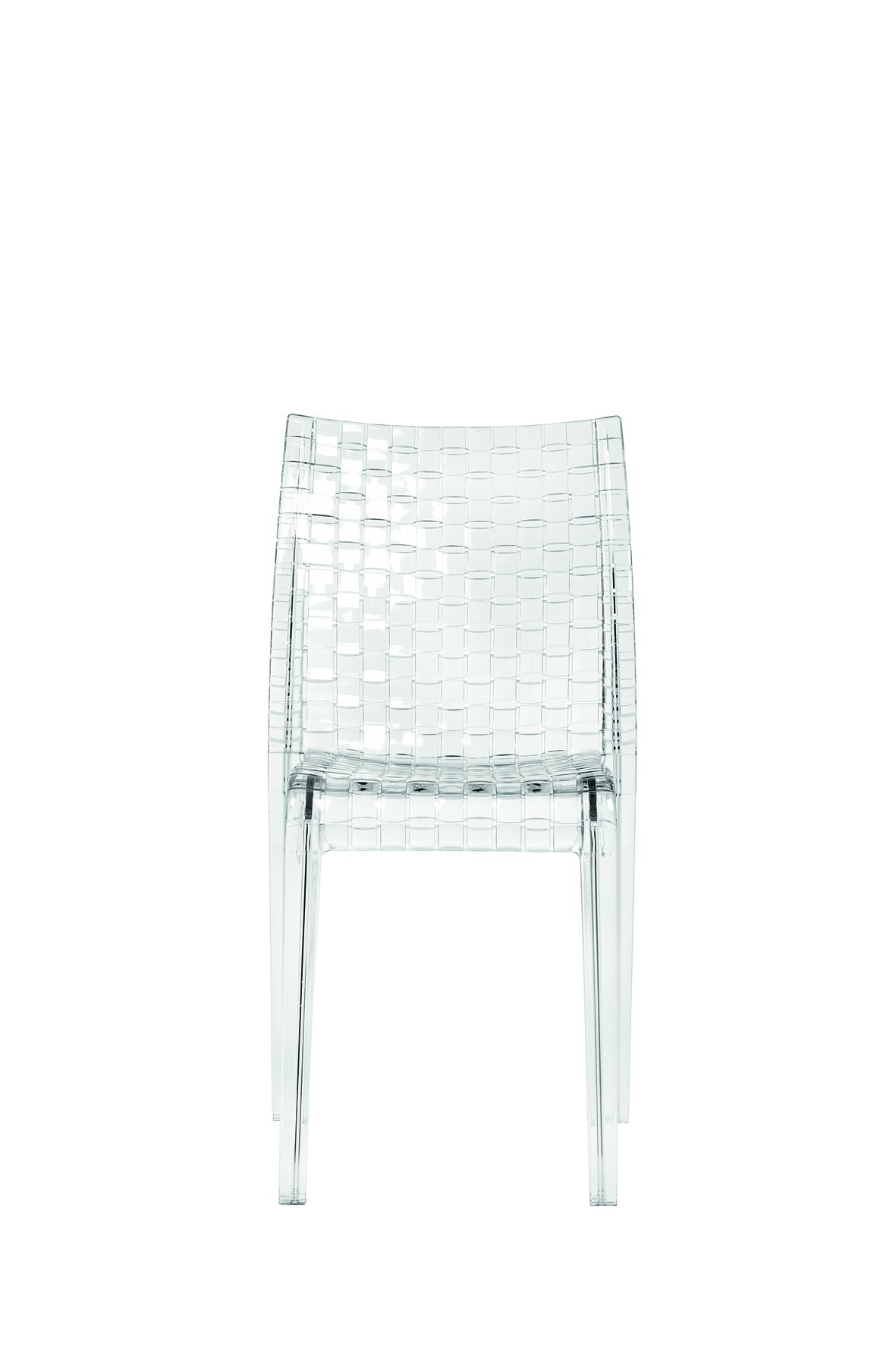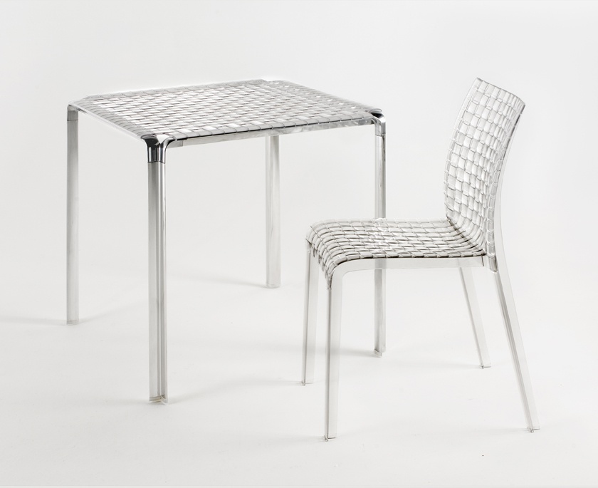 Italian furniture for dining room Kartell production. Set includes: dining table and chairs. Frames made of polycarbonate. Figure tabletops and seats are reminiscent of decorative weaving. Finish offers transparent, white, red, grey or black. Set is made in modern style.