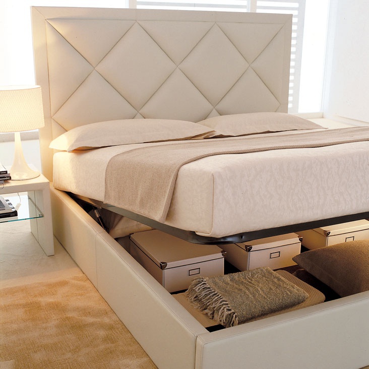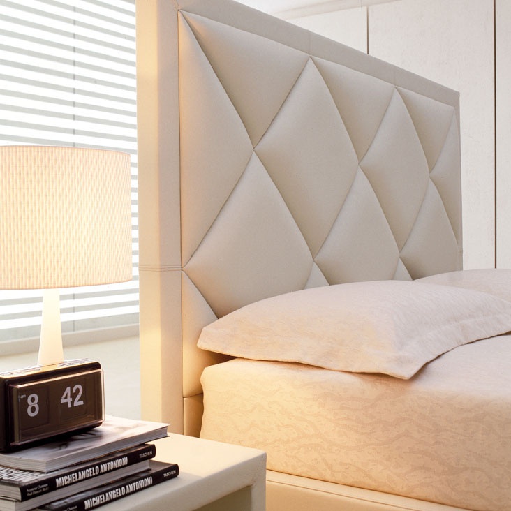 Headsets for bedrooms from Italian manufacturer Cattelan Italia. Set consists of a double bed, bedside tables, chest of drawers. Materials: wood, textile, leather, glass. Colours in stock.