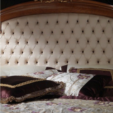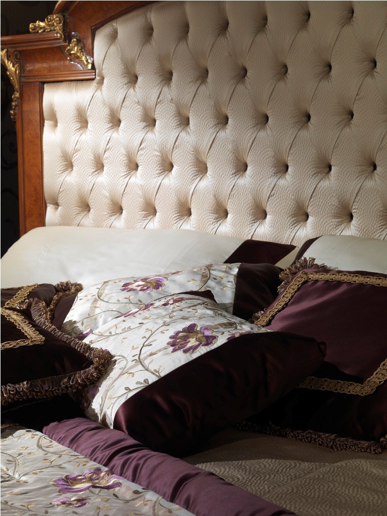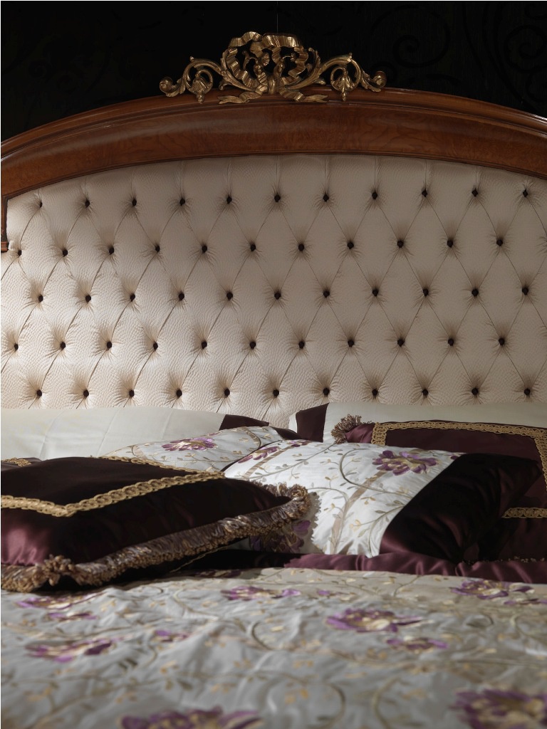 Headsets for bedrooms from Italian manufacturer Citterio. Set consists of a double bed, bedside tables and wardrobe. Furniture from solid wood. Headboard covered with white leather ornament is stitch-Capito. The model is decorated with hand-carved gilded.