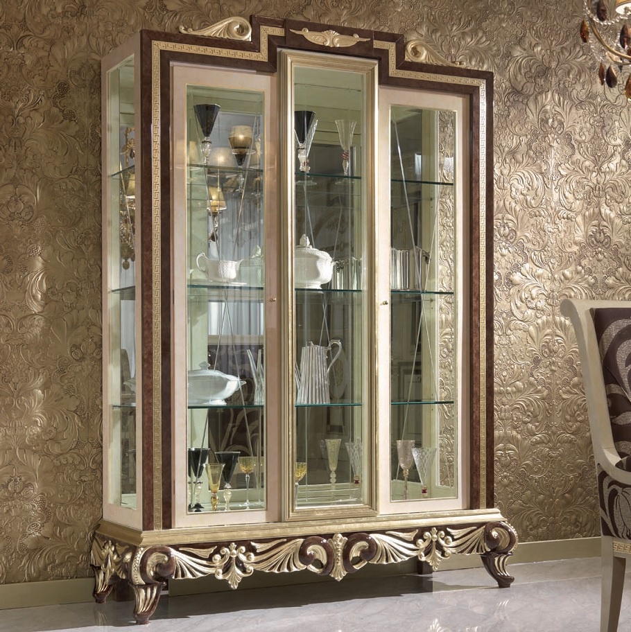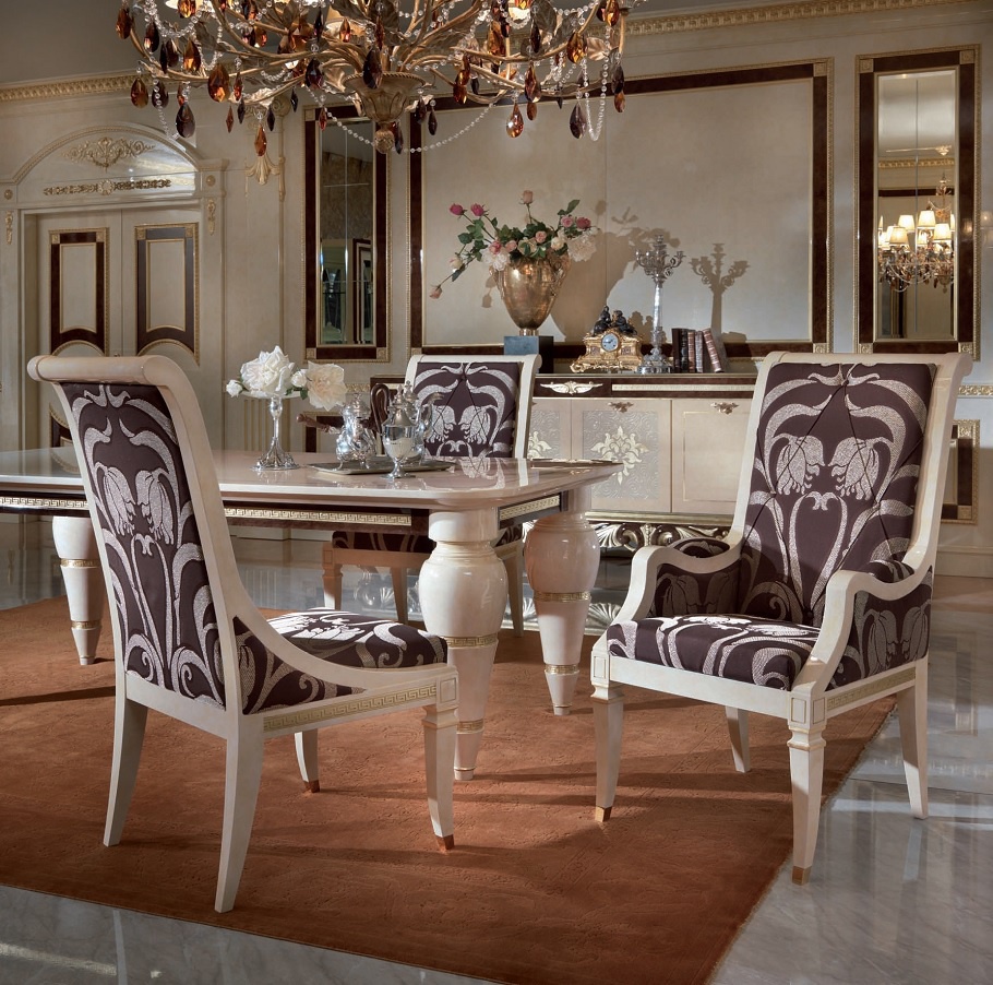 Set for the dining room Hermitage from the Italian manufacturer Turri. Includes dining table, chairs, a showcase and a sideboard. Models made from solid wood and a high gloss finish. Chairs with or without armrests in fabric. Shelves and sash Windows of clear glass. Swing doors are locked. Decorated models are hand carved, covered in gold leaf and artificially aged. Set made in a classic style.