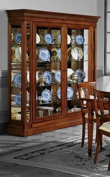 Showcase from Italian producer Le Fablier. Model made of solid wood. The sash and the sides glazed. Internal filling - glass shelves. Decorative metal fittings. The model is characterised by its elegance and luxury. Made showcase in classical style.