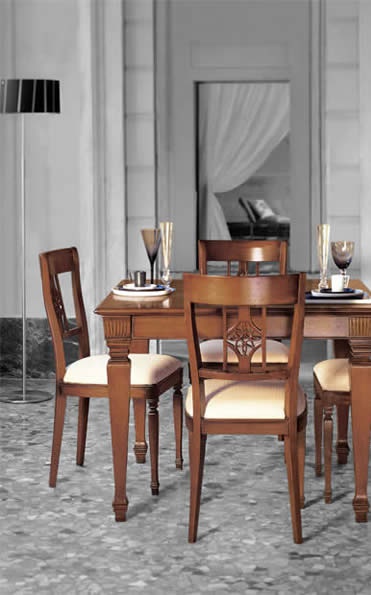 Set for the dining room from Italian manufacturer Le Fablier. Includes dining table and chairs. Frames models made from solid wood. The tabletop is square shaped. Chairs fabric in white colour. Decorated models are hand carved. Set made in a classic style.