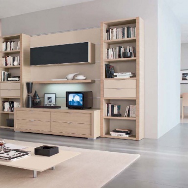 Modular storage system from Italian manufacturer Morassutti. The frame is made from solid wood. Module for books and TV with drawers. A great model for living room in modern style. Product color natural wood.