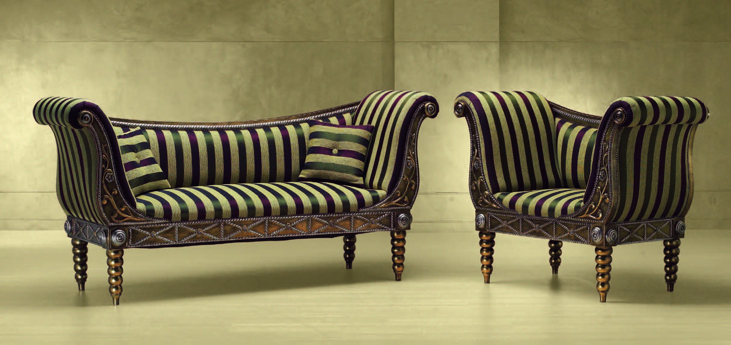 Sofa set from the Italian manufacturer Morello Gianpaolo. Set includes loveseat and chair. The furniture is made from solid natural wood finish high gloss varnish. Filler - polyurethane foam. Upholstery - textiles from a range of campaigns. The design of complementary decorative pillows. Colours in stock.