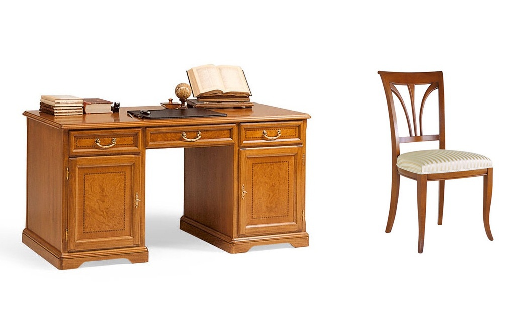 Set for Cabinet Verona/Garda&Milano from the Italian manufacturer Selva. Includes Desk and chair. Material - solid wood. Finish to be selected from the range of the company. Decorative accessories made of metal covered with gold leaf. Swing doors can be locked. Chairs fabric in white colour. Set made in a classic style.