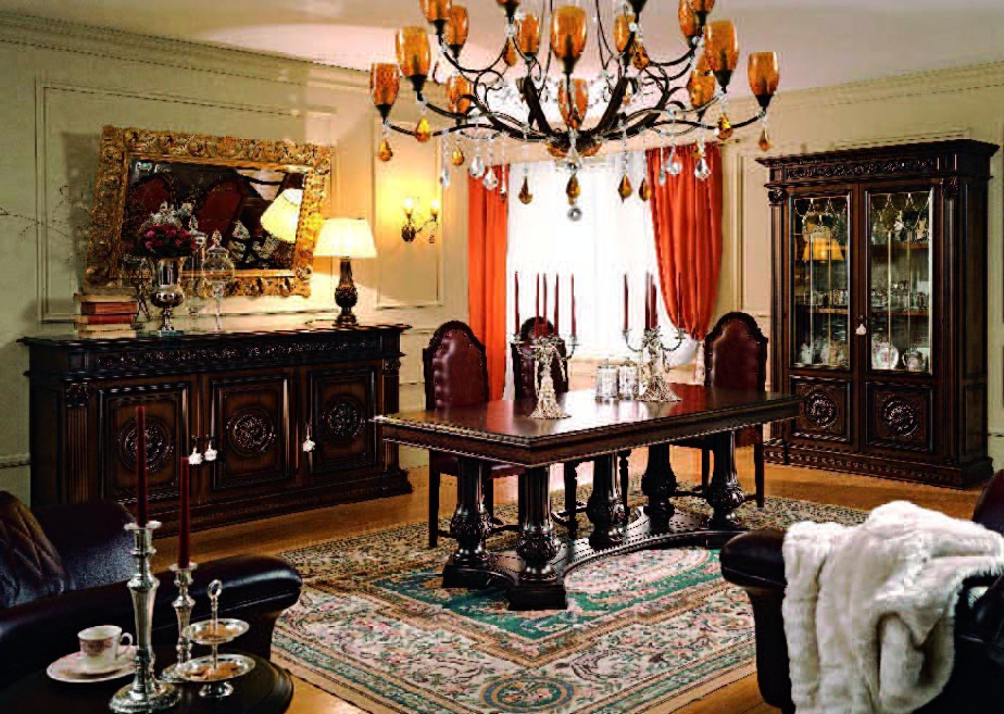 Set for the dining room from Italian manufacturer Mobil Deri. Set includes dining table, chair, chest of drawers and a sideboard. The furniture is made of natural wood, the surface is treated with lacquer. The doors of the sideboard - glass. The upholstery is genuine leather. The table is rectangular. The color of natural wood products.