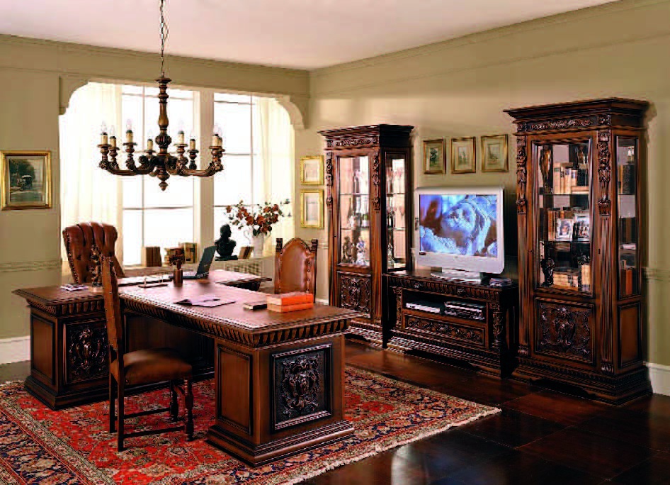 Headsets for the office from the Italian manufacturer Mobil Deri. Set includes wall TV, Desk, chair and armchair. The furniture is made of natural wood. Door wall - glass. Upholstery of chairs and seats - natural leather. Finish options: lacquer/inlay/antique. Colors: sand, natural color of the wood.