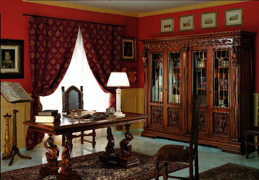 Headsets for the office from the Italian manufacturer Mobil Deri. Set includes a Desk and a wardrobe. The furniture is made of natural wood. Cabinet doors - glass. Finish options: lacquer/inlay. Complement the elegant design of the table legs. The color of natural wood products.