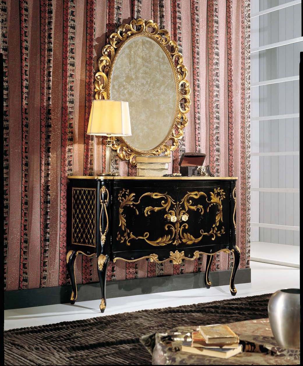 A chest of drawers from Italian manufacturer Modenese Gastone. Моде6ль made in the classic style. Frame and legs made from solid wood. Finishes available in combinations of black and gold. Accessories metal. Decorated model ornament on vegetable-themed and decorative hand-carved.