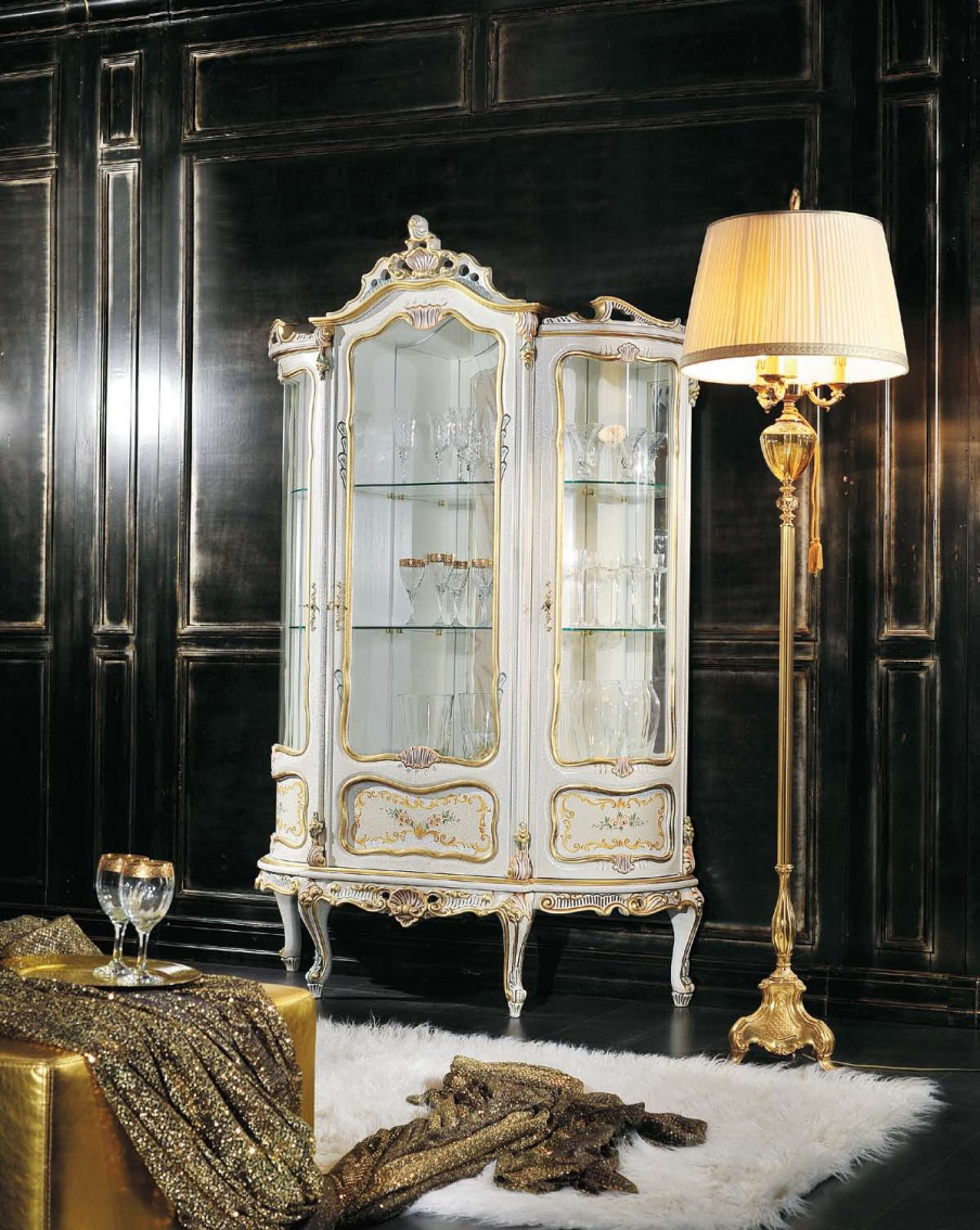 Showcase from Italian manufacturer Modenese Gastone. The model is made in classic style. With elegant and exquisite design. The frame and legs made from solid wood. The finish is offered in white color with Golden elements. Shutters and shelves made of transparent glass. Accessories metal. The model is decorated with a hand carved and hand painted vegetable theme.