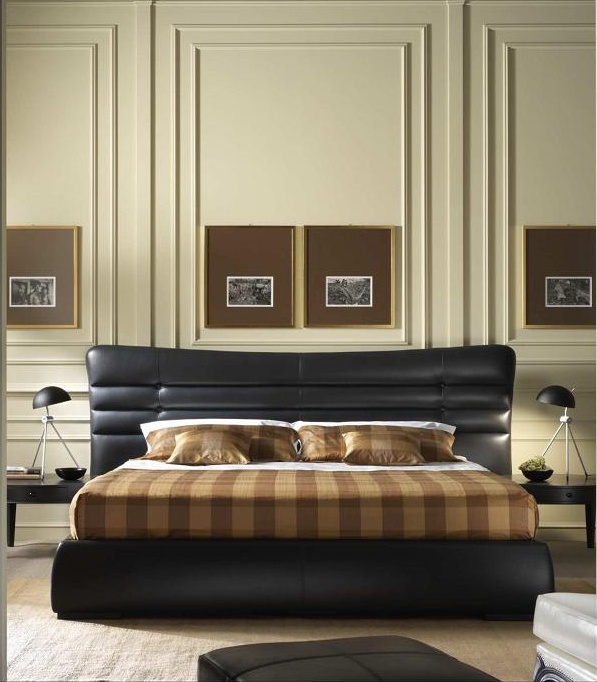 Italian furniture for bedroom production of L'origine. Set includes: double bed with Viscom and upholstered headboard and round bedside table. The frames are made of wood. Upholstered in leather from the company portfolio. Finishing varnish from the company portfolio. The headboard is decorated with stitch.