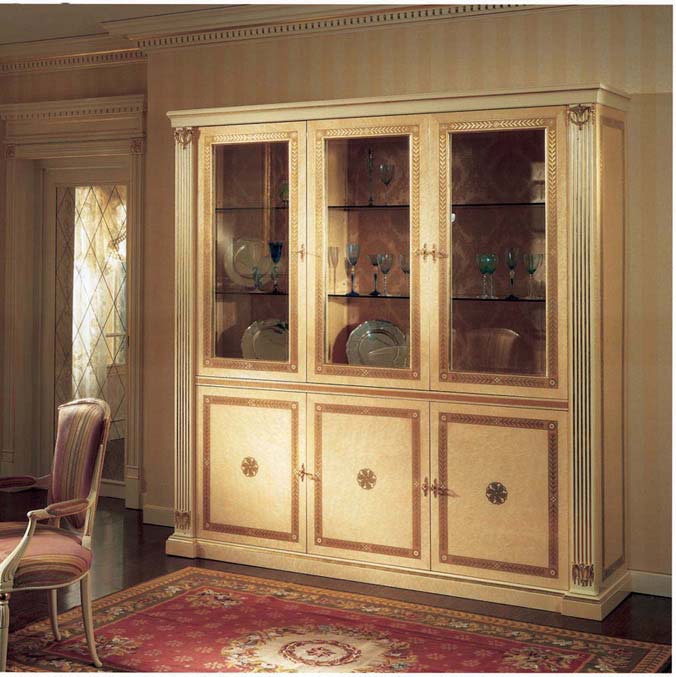 The buffet from the Italian manufacturer OAK. The model is made of solid wood. The upper part glazed, the lower deaf. Internal filling - glass shelves. Swing doors are locked. The model is decorated with decorative inlays, gilded. A snack bar is made in classic style.