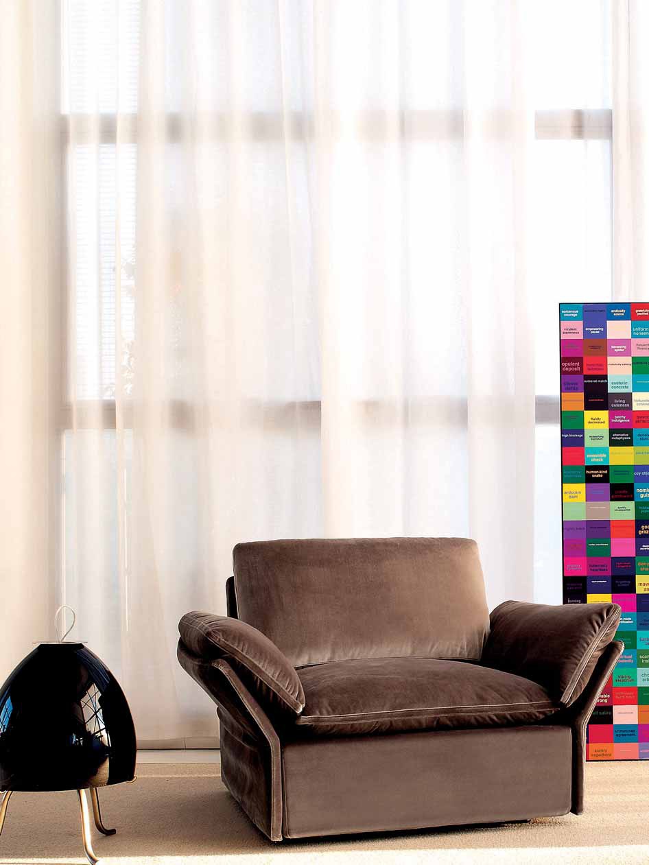 The armchair from Italian manufacturer Nube. Model with a hidden frame. Low legs are made of solid wood. Upholstery textile to choose from a catalog company. The backrest and armrests complemented with soft cushions. Made chair in a contemporary style. Is comfortable and elegance.