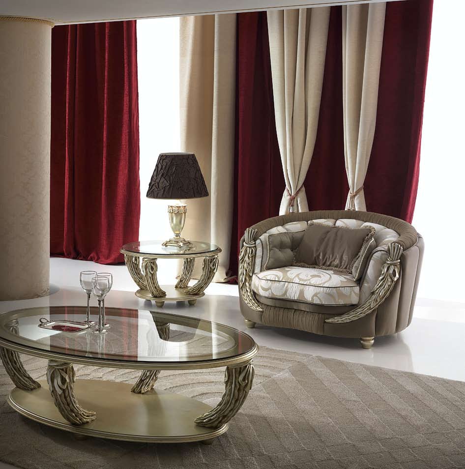 Sofa set from the Italian manufacturer Paolo Lucchetta. Includes coffee table, armchair and bedside table. Frames models made from solid wood. Design underline legs unusual shape. Countertop oval and round shape made of transparent glass. Upholstery textile from the company portfolio. Set made in a classic style.