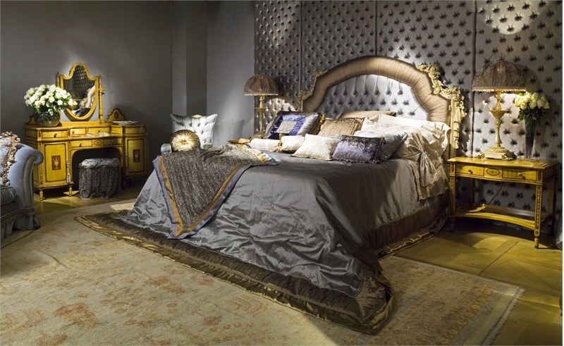 Headsets for bedrooms from Italian manufacturer Provasi. Consists of double bed, dressing table, bedside tables and pouf. Frames made of solid wood. Finish to be selected from the range of the company. Upholstery textiles/leather. Semi-circular headboard with decorative stitch-Capito and hand carved. Set made in a classic style.