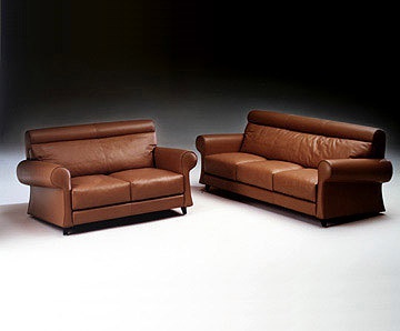 Sofa set from the Italian manufacturer Rossi di Albizzate. Consists of three-seater sofa and armchairs. The armrests and backrest with a rounded shape. Lattice models are completely covered with skin. Color option brown. Legs in solid wood. Filler - foam of varying stiffness. Practical and comfortable set is made in modern style.