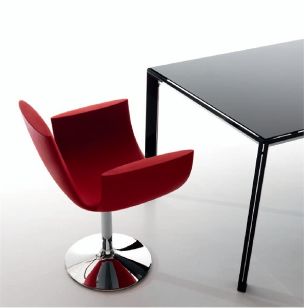 Set for the dining room from Italian manufacturer Sintesi. Consists of dining table and chairs. The frame and legs made of metal. The varnish finish offered in black. The model is complemented by two retractable tops. Seat and backrest made of plastic in white or red. Headsets are made in a modern style.