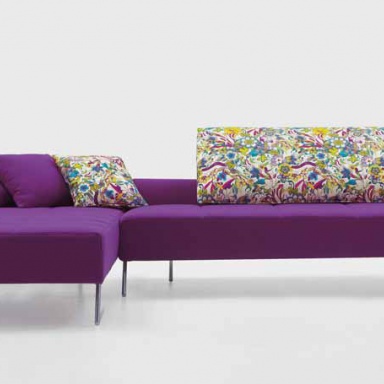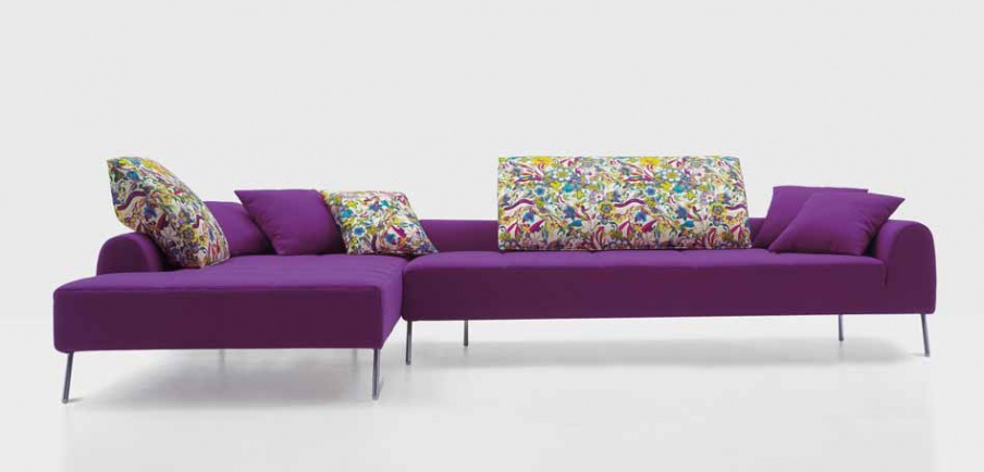Corner sofa from Italian manufacturer Nube. The model is made in modern style. The frame is completely hidden. Legs in chromed metal. Upholstery textile from the company portfolio. A distinctive feature of the model with low backrest and armrests. In addition offers decorative pillows in various sizes.