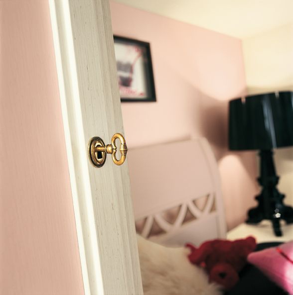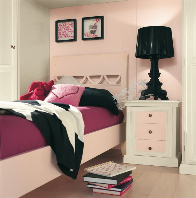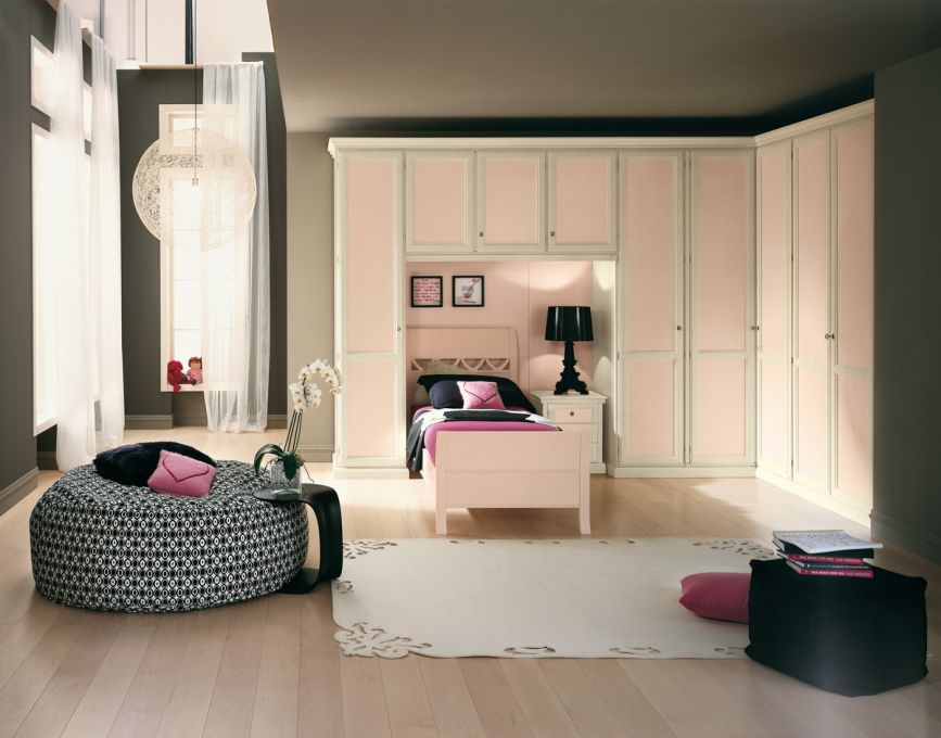 Set for children's Opera by Italian manufacturer Favero. Set includes wardrobe with allocated space for a bed, Ottoman with built-in table. The furniture is made of solid wood. The bed is complemented with a drawer for storage. Colours pale pink tone.