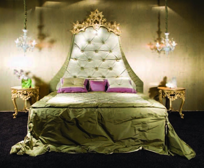Double bed from Italian manufacturer OAK. The frame is made from solid wood. High headboard curly shape. Upholstery textile. Variant colors and textures to choose from a range of companies. The ornament serves as a decorative stitch-Capito and hand carved. The bed is made in classic style.