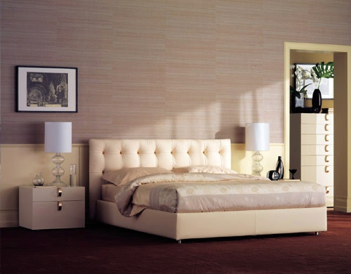 Set for bedroom Italian manufacturer Flou. The presented models have double beds and bedside tables. Skeleton models made of solid wood. The upholstery is genuine leather. A low headboard decorated with stitch-Capito . Wonderful two bedroom model with soft and high headboard is designed for bedroom in a modern style. Product color white.