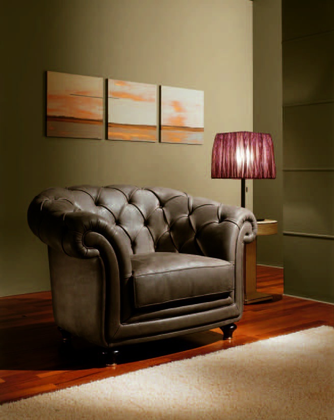 A chair from the Italian manufacturer Origgi Salotti. Model on low legs curly shape. Material - solid wood. The armrests and backrest with a rounded shape. Seat cushion is removable. Upholstery leather from the company portfolio. The ornament serves as a decorative stitch-Capito. A chair made in a contemporary style.