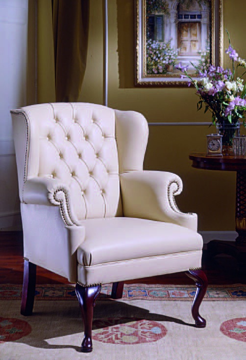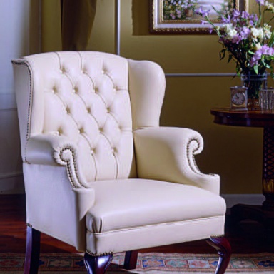 A chair from the Italian manufacturer Origgi. The model is made in classic style. The frame and legs of solid wood. Legs are covered with a glossy varnish. The high back model. The armrests in the form of a scroll. Leather upholstery in white. The model is decorated with stitch-Capito furniture and carnations.