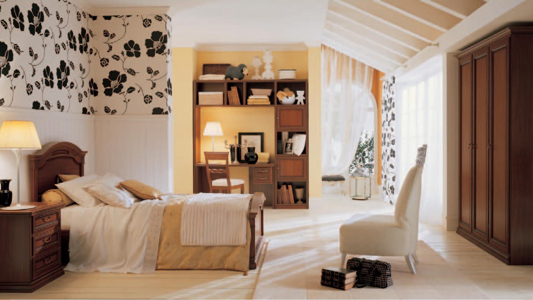 Set for children by Italian manufacturer Alf. Set includes a single bed with a high headboard and footboard, bedside Cabinet, modular system for storing books, wardrobe, Desk, chair with soft upholstery and chair in a bright fabric. The furniture is made of solid wood. Colours in stock.