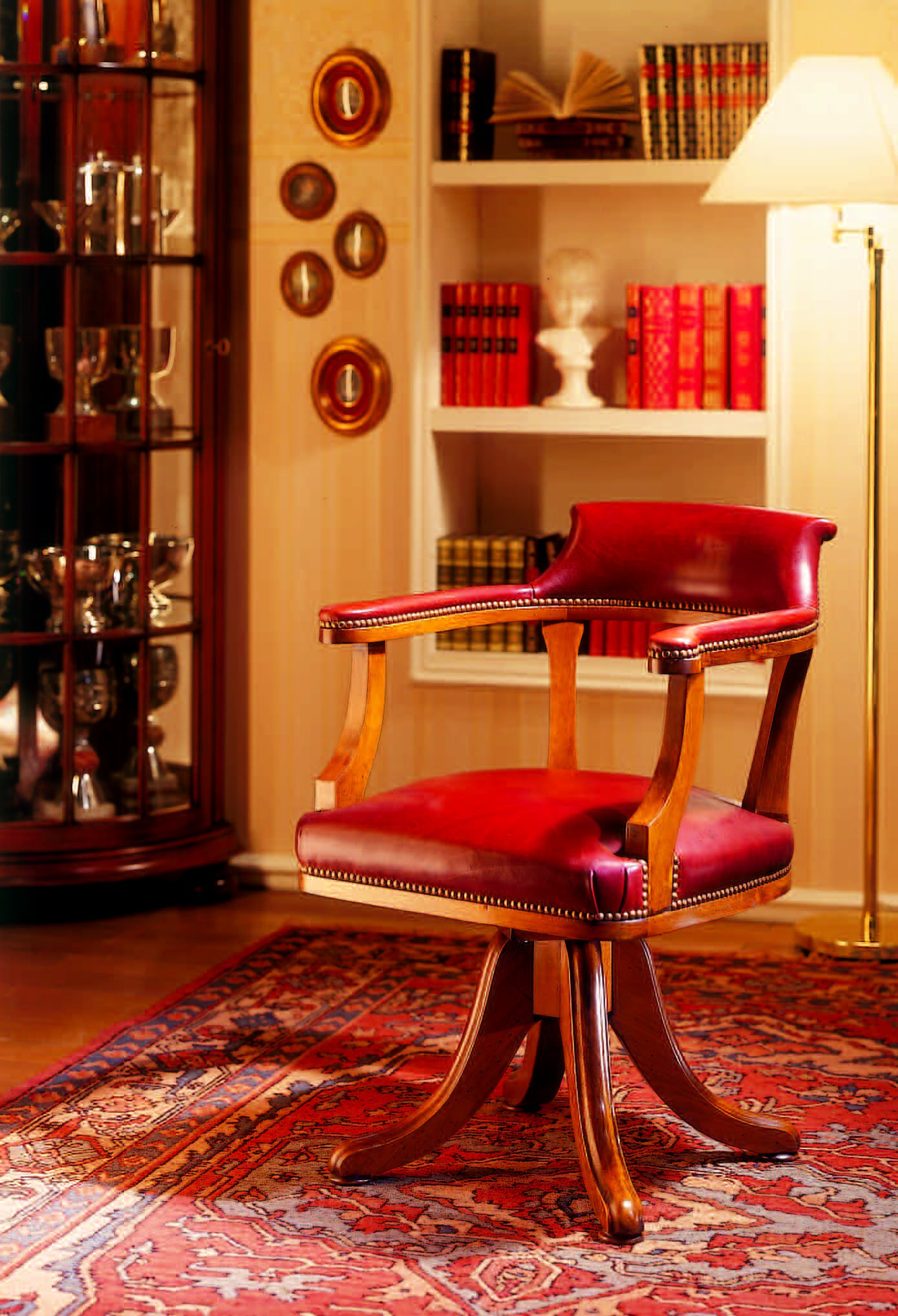 A chair from the Italian manufacturer Origgi Salotti. The model is made in classic style. The frame and legs are made of solid wood. Seat and back are covered with leather from the company portfolio. The armrests are complemented with soft pads. Finishing available in color combinations of natural wood and red. The design of complementary decorative furniture studs.