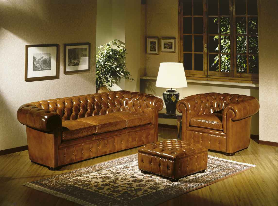 Sofa set from the Italian manufacturer Origgi Salotti. Consists of a triple sofa, armchairs and pouf. Low legs are made of solid wood. Frames fully upholstered in leather from the company portfolio. The seat cushion is removable. Filler - foam of varying stiffness. The armrests and backrest decorative decorated with stitch - Capito.Set made in a classic style.