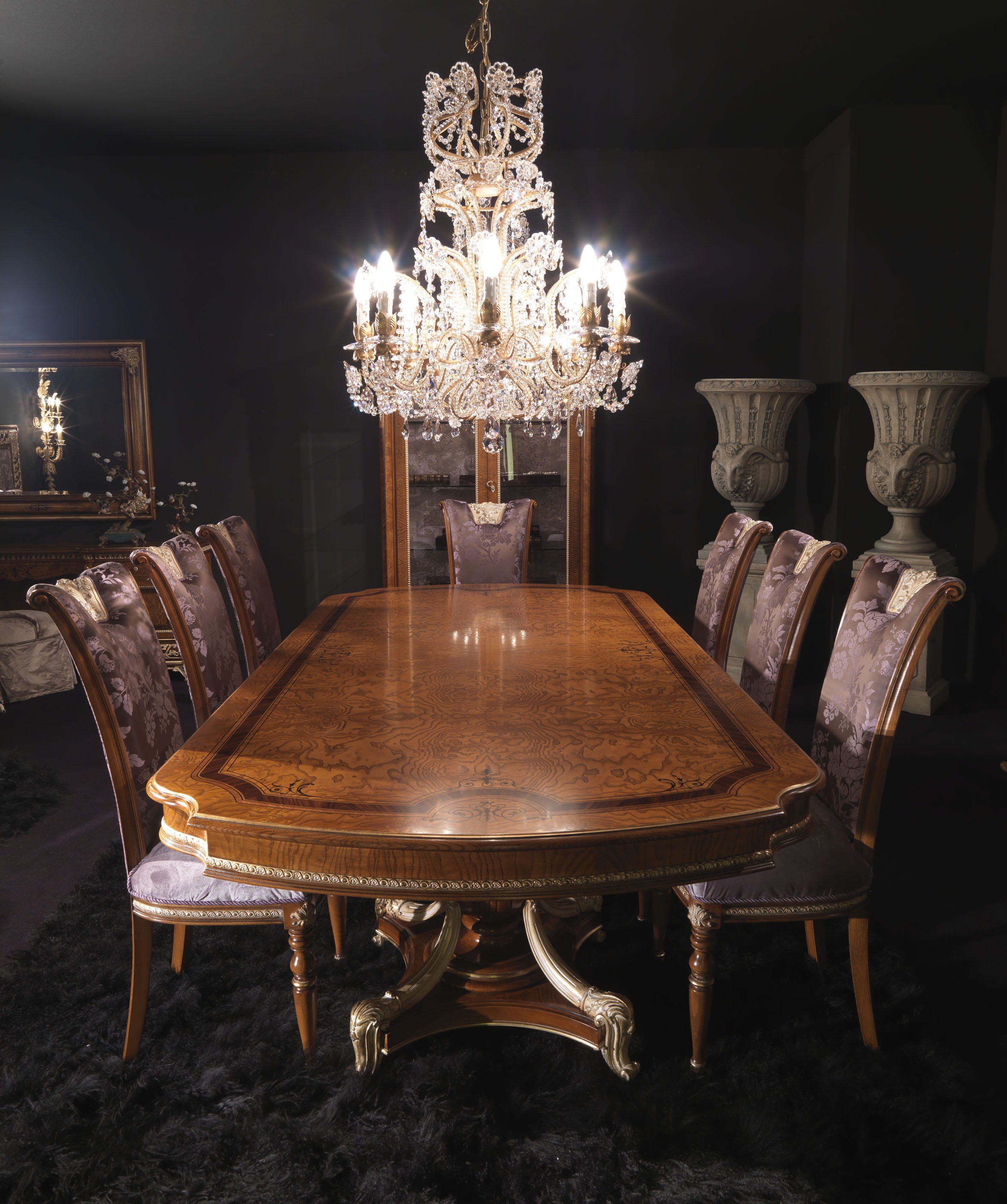 Set for the dining room from Italian manufacturer Jumbo Collection. Includes dining table and chairs. Material - solid wood. The finish offers a glossy lacquer and gilding. Chairs without armrests. Upholstery textile from the company portfolio. The model is decorated decorative hand carved. Set made in a classic style.