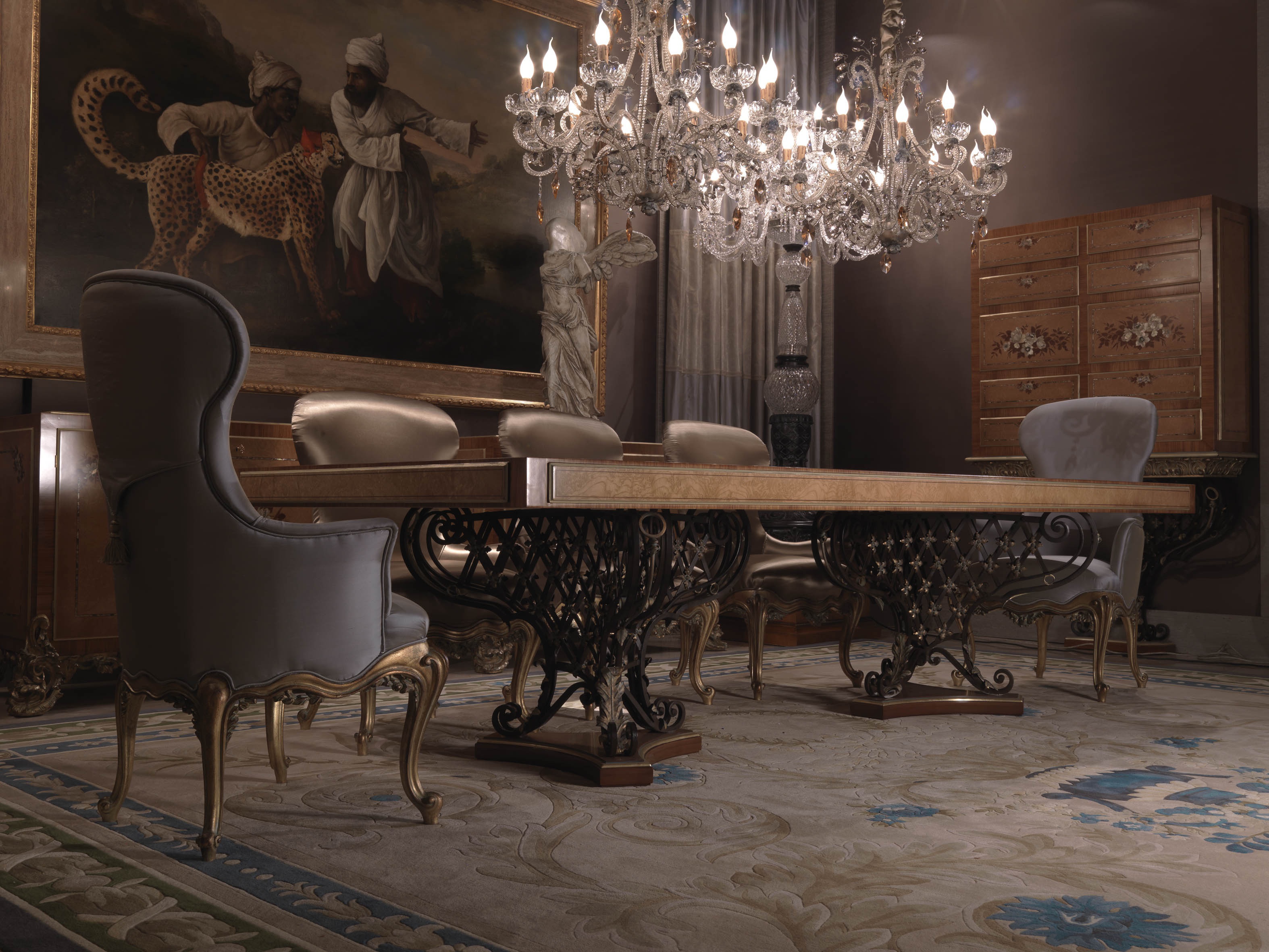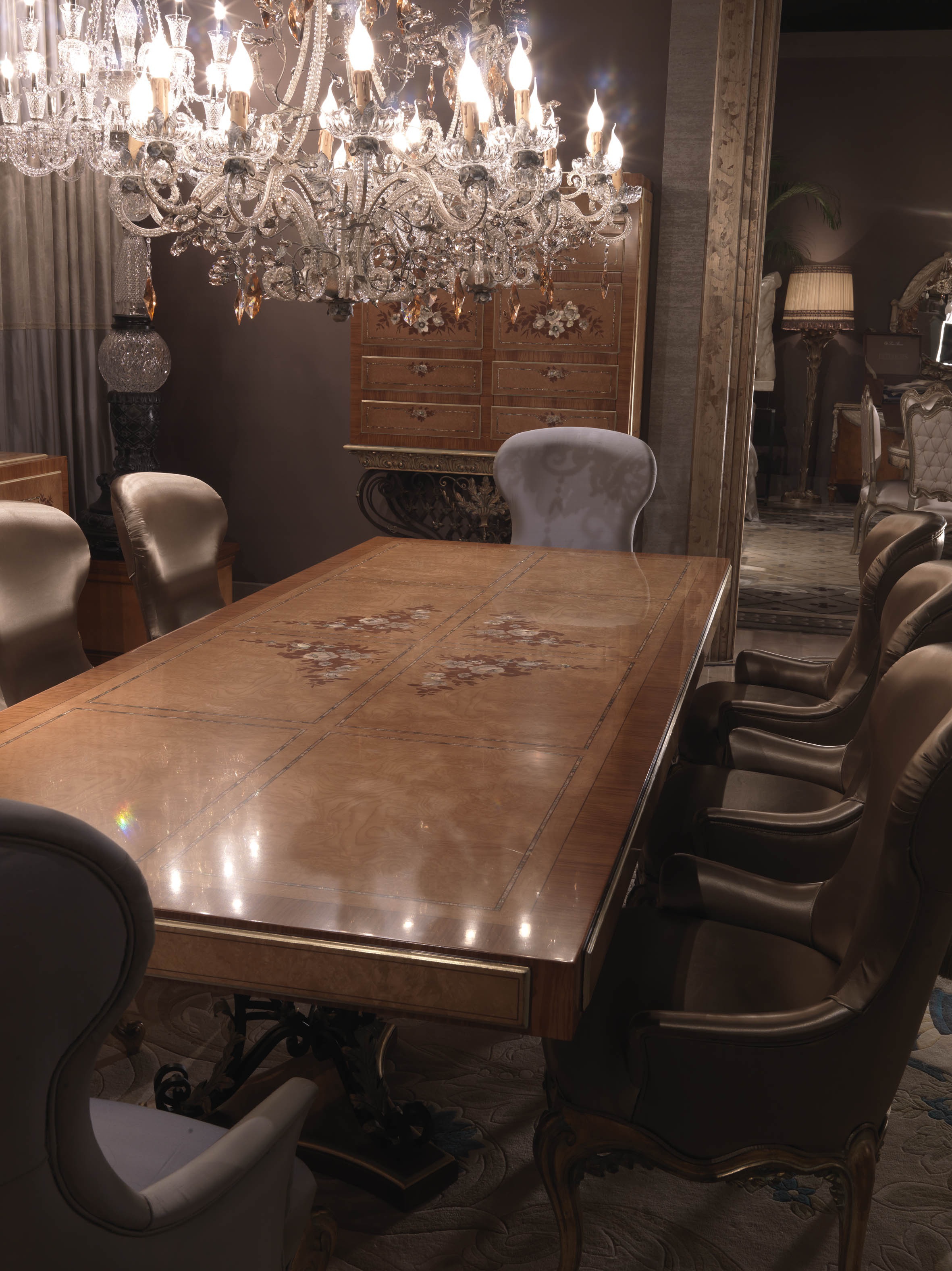 Set for the dining room from Italian manufacturer Jumbo Collection. consists of dining table, chairs and wardrobe. The legs of models made of metal. Frames made of solid wood. Chairs upholstered in textiles from the company portfolio. Surface countertops with decorative painting. The metal fittings. Set made in a classic style. Attracts attention with its unusual design. Perfectly fits and complement the interior of your home.