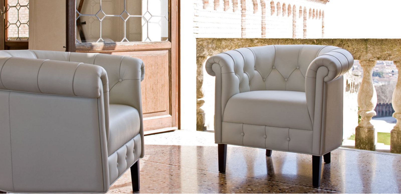 Chester classic armchair from Italian manufacturer Alberta Salotti. Upholstered in leather from the company portfolio. The legs are made of wood. Colours in stock. The perfect choice for a living room in classic style.