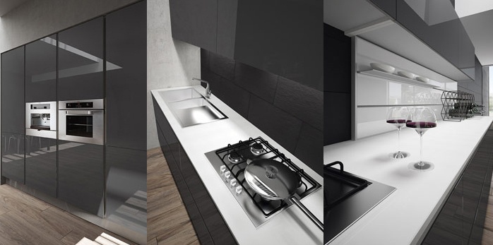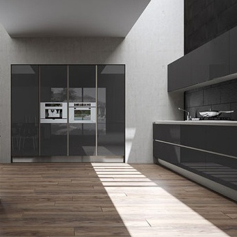 The kitchen is Light METALLIC GREY from the Italian manufacturer Arrital Cucine. The door is made of acrylic and countertops made of quartz agglomerate. The color of this model grey.
