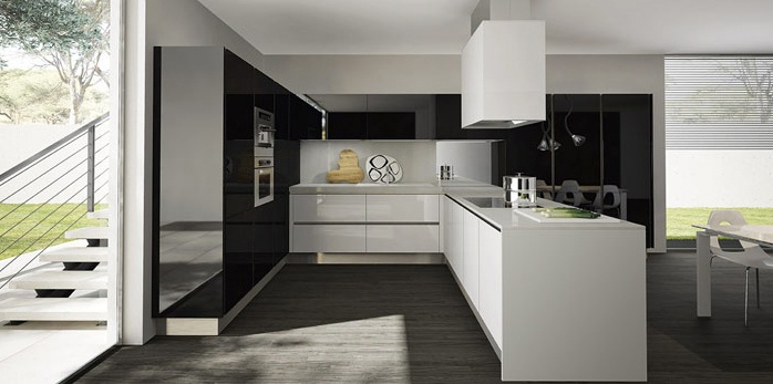 Kitchen Light GLOSSY WHITE AND BLACK from the Italian manufacturer Arrital Cucine. The door is made of acrylic ,countertop from quartz and glass agglomerate. Chair made of polycarbonate. The color of this model is white and black.